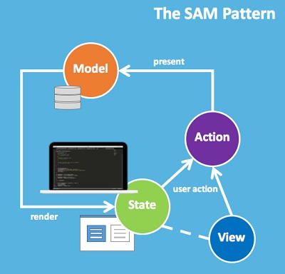 - The SAM pattern is implemented using 4 classes. SamModel, SamState, SamActions and SamView. When the 4 are linked together they are referred to as